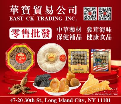 紐約华宝贸易公司 (EAST CK TRADING INC.) 主营【参茸海味中药材批发】 产品项目广泛, 包括: